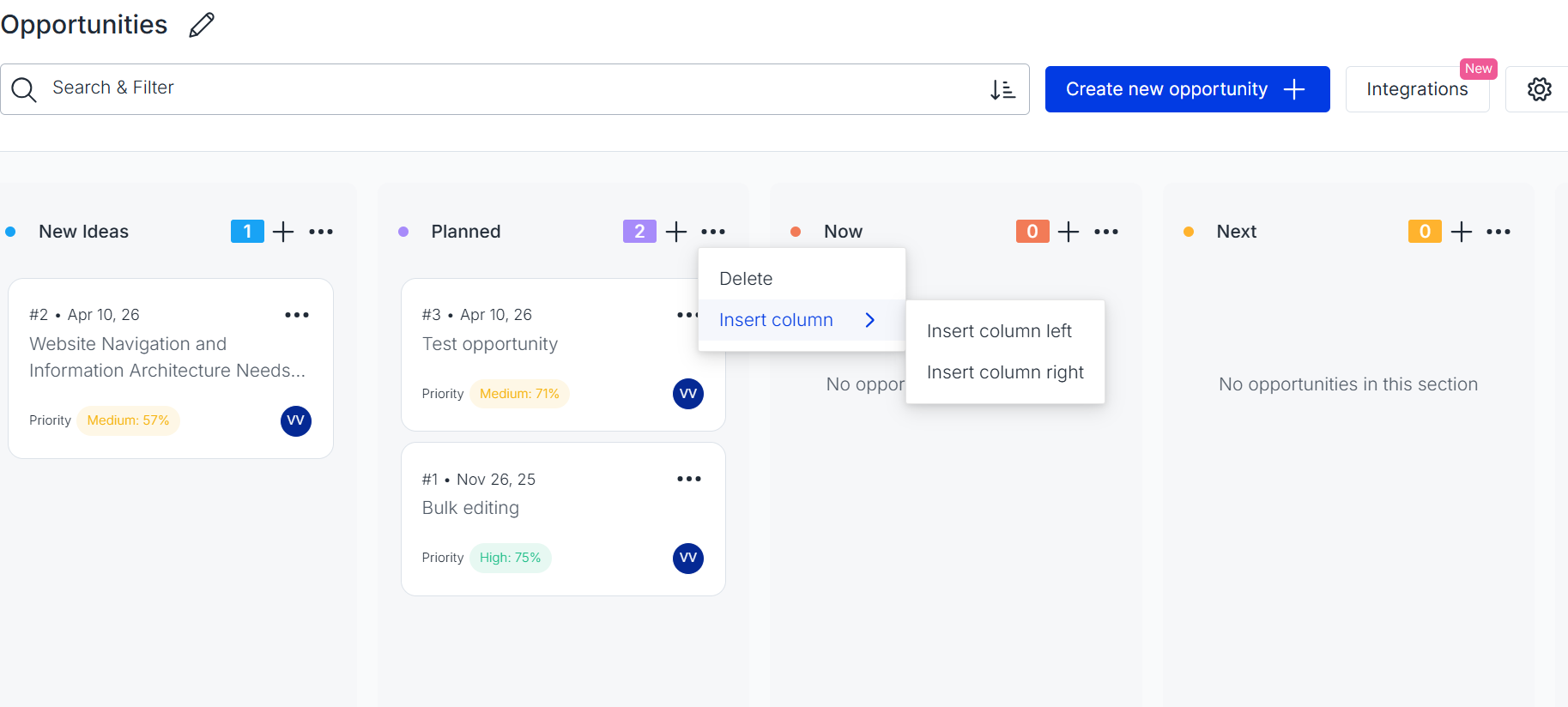 You can create an opportunity from a hypothesis or a solution, or start one from scratch when you identify a new idea or problem worth exploring. Because the board is on the space level, it can be used across multiple projects and offer a central view on your research. Each opportunity lives in a shared Opportunity Board, giving your team a clear, visual way to manage discovery and prioritize what to work on next.