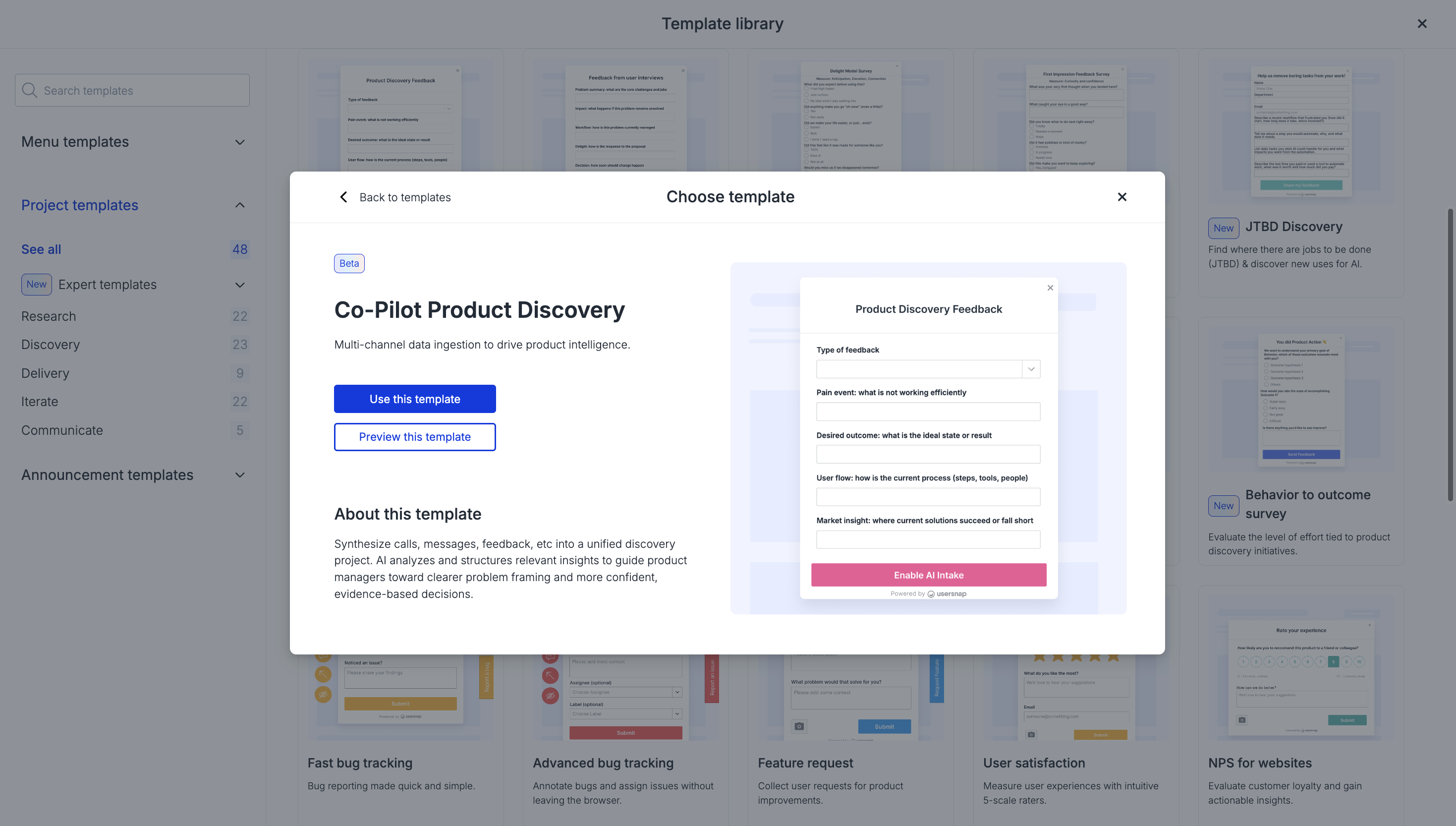 Send all customer calls and user interviews into the co-pilot discovery project by using the designated template to track and analyze pain points and opportunities.
